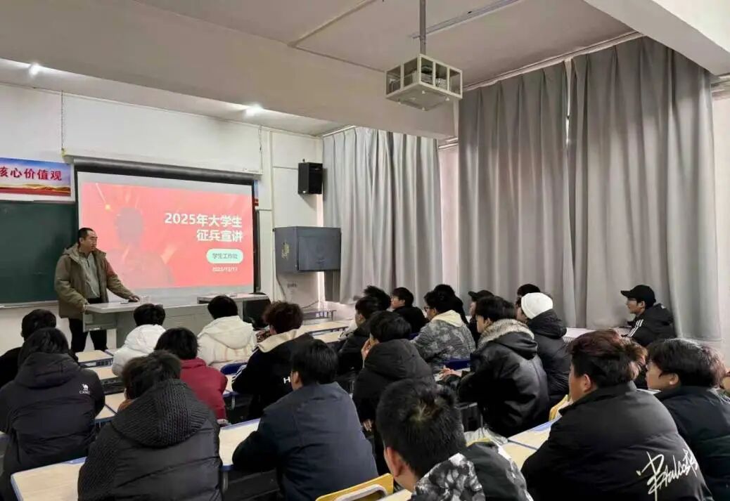 为激发学生参军报国热情,精准解读征兵政策,助力国防和军队现代化建设,12月17日下午,美术学院在明雅楼505召开2025年大学生征兵宣讲会。邀请校学生工作处国防教育科科长荆松涛老师为学生进行宣讲。