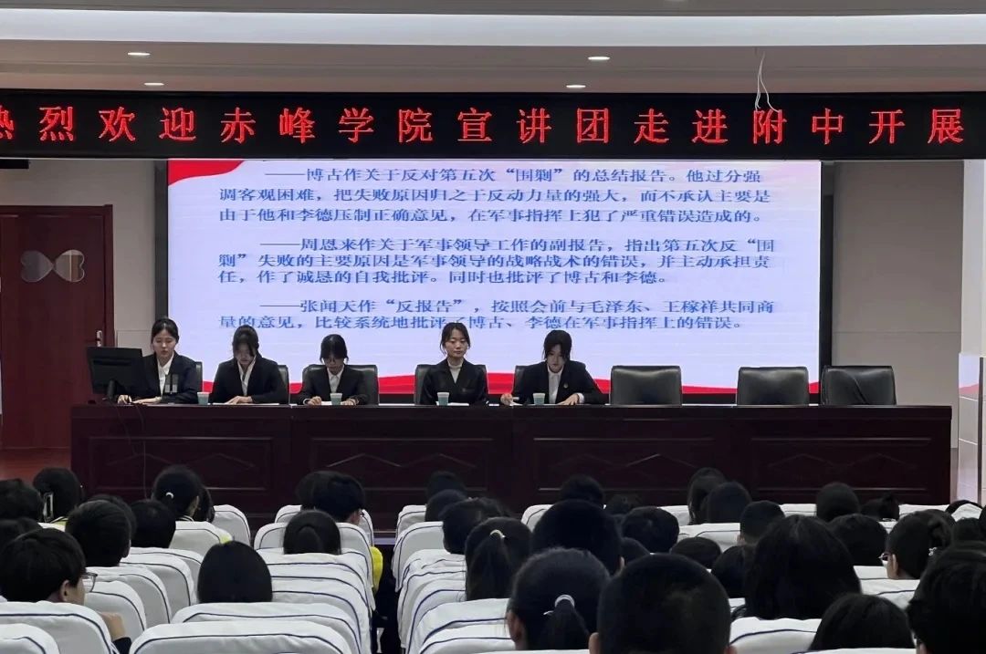 为引领青年学生传承弘扬遵义会议精神,赓续红色血脉,在遵义会议召开90周年之际,美术学院“艺心向党 青春红色筑梦”遵义会议精神志愿宣讲团于近期走进PP电子游戏网站附属中学,为百余名师生开展了一场以“遵义会议和遵义会议精神”为主题的宣讲。