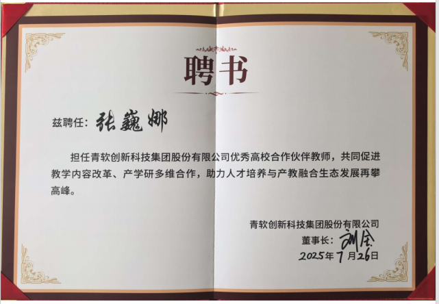 在大会分论坛“智能时代下产教融合创新实践专题研讨会”上,闫利华、张巍娜两位教师凭借在产教融合领域的积极实践与突出表现,荣获优秀教师称号,并被正式聘任为青软优秀高校合作伙伴教师。