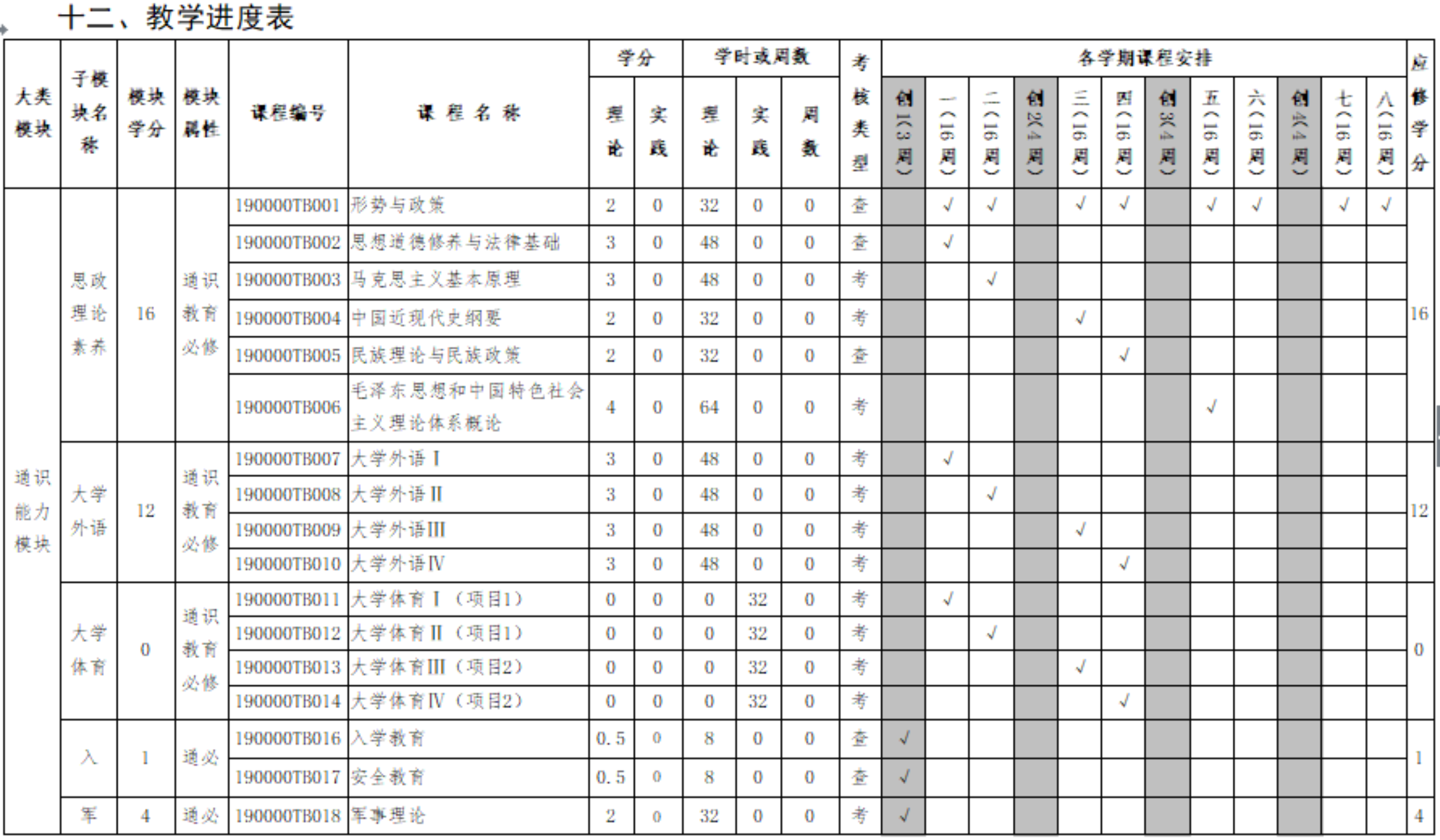 注:1.各专业选择相应模块,多余的模块整行删除;(本注释在制订方案时删除)