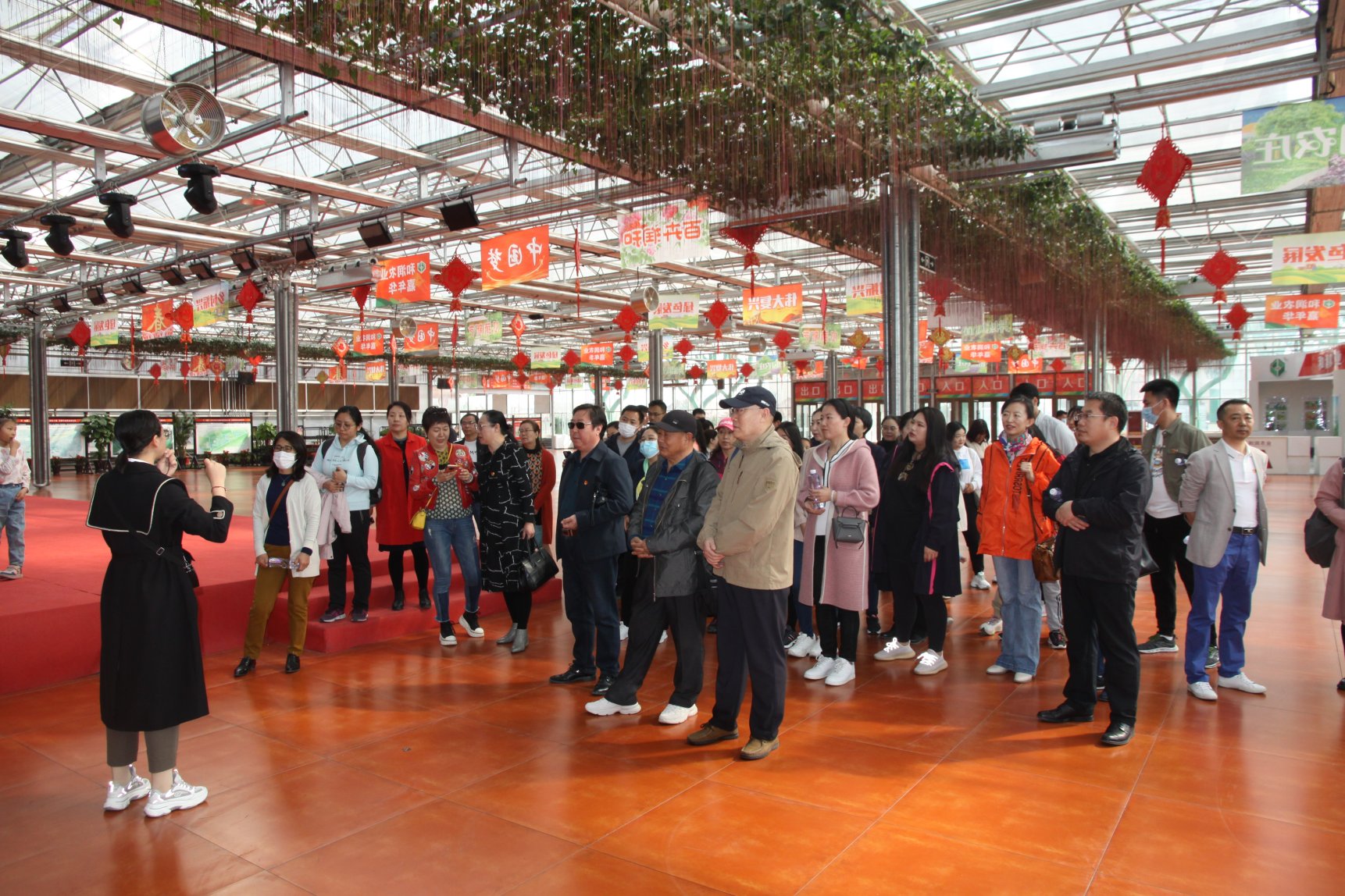 在和润农业园,大家跟随着讲解游览了万世民丰展览馆,按着中国共产党发展的历史足迹,从由生姜堆砌的“江山”到由南瓜组成的“走进新时代”,再到由豆子拼起的“一带一路”,一个个由农业蔬菜筑成的党史学习教育景观,引得大家驻足观看。