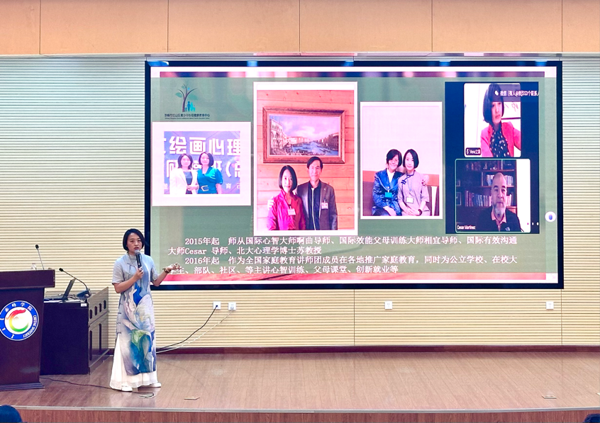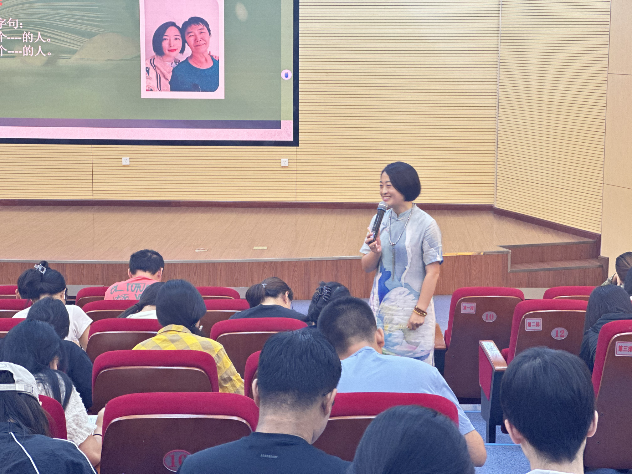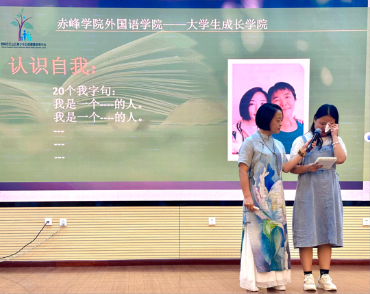 会上,郭老师用短句“我是一个….的人”让同学们亲身体验了一场心理疗愈过程。同学们纷纷掏出纸笔,仔细思考自己的性格特点。2021级英语一班冯暄暄同学与2022级英语一班薛圳鑫同学上台向大家分享自己的感悟。
