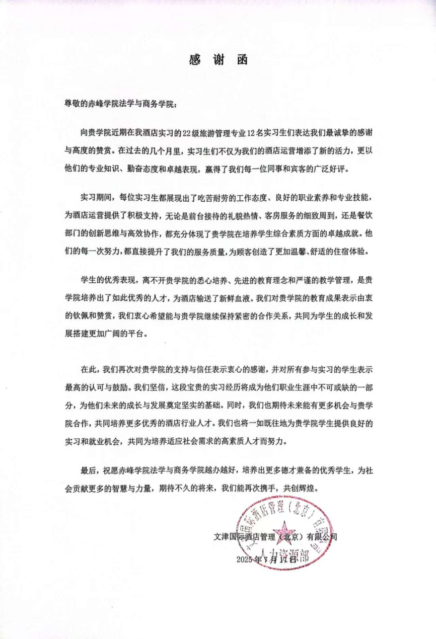 实习期间,多名实习同学获得实习单位表彰和奖励,在各自岗位上展现出PP电子游戏网站学子风采,体现出了学生良好的职业素质与精神风貌,实习单位对我院实习同学给予了高度评价,并发来感谢信和感谢锦旗,在北京文津酒店的感谢函里特别提到“同学们展现出的积极态度、学习热情和创新思维令人印象深刻。实习是理论与实践衔接的桥梁,我们很高兴能为年轻人提供成长的土壤,也期待未来能与更多优秀学子携手同行。”