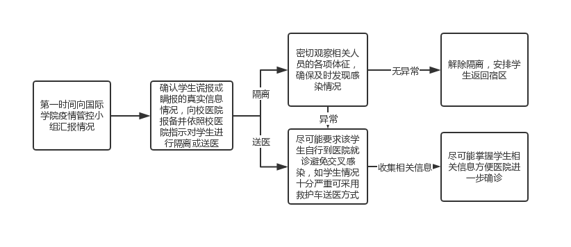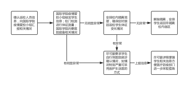 处理此类突发情况时,须首先向学校疫情管控领导小组汇报,同时确认学生生理体征状况。如发现体征异常,须要求学生到医院确认是否感染病毒,对于无明显体征异常的学生,应安排隔离观察。