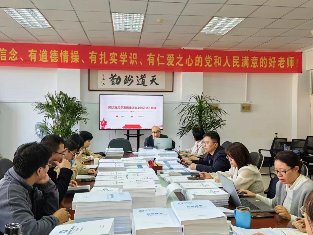 坚守中华文化立场,传承中华文化基因,坚持以社会主义核心价值观引领文化建设。2023年10月23日,历史文化学院开展书记讲党课活动,党总支书记于畅夫对《在文化传承发展座谈会上的讲话》进行解读,历史文化学院全体教职员工参加此次活动。