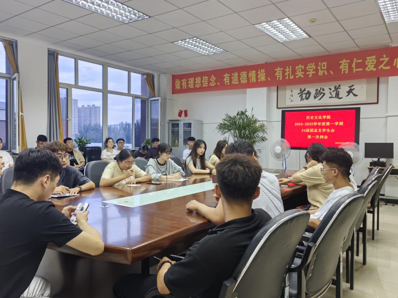 为迎接新学期的到来并确保学生会各项工作的有序开展,深化学生会内部建设,全面提升学生成员的工作能力和责任意识,明确新学期的核心任务和工作导向,历史文化学院于2024年8月21日晚上,召开了2024-2025学年度第一学期24届团总支学生会第一次例会,全体学生会成员参加。