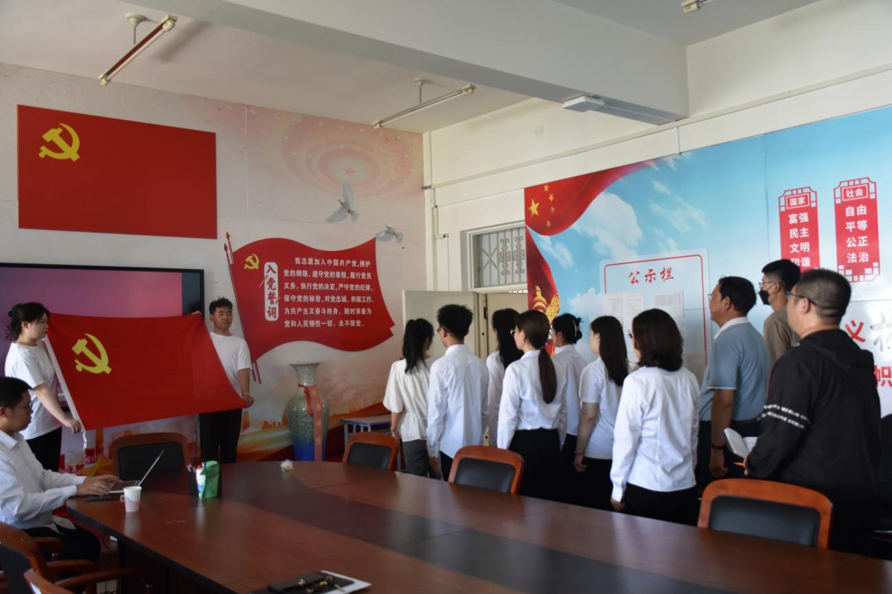 宣誓仪式在参会人员奏唱《国际歌》的歌声中拉开帷幕。宣誓仪式正式开始,在领誓人郭欣同志的带领下,宣誓党员面对党旗,举起右拳,用激昂的声音庄严宣誓:“我志愿加入中国共产党,拥护党的纲领,遵守党的章程,履行党员义务,执行党的决定,严守党的纪律,保守党的秘密,对党忠诚,积极工作,为共产主义奋斗终身,随时准备为党和人民牺牲一切,永不叛党!”新党员依次响亮地报出自己的名字,他们将终生铭记这一光荣时刻。宣誓仪式后,老党员为新党员戴上了象征党员身份的党员徽章。