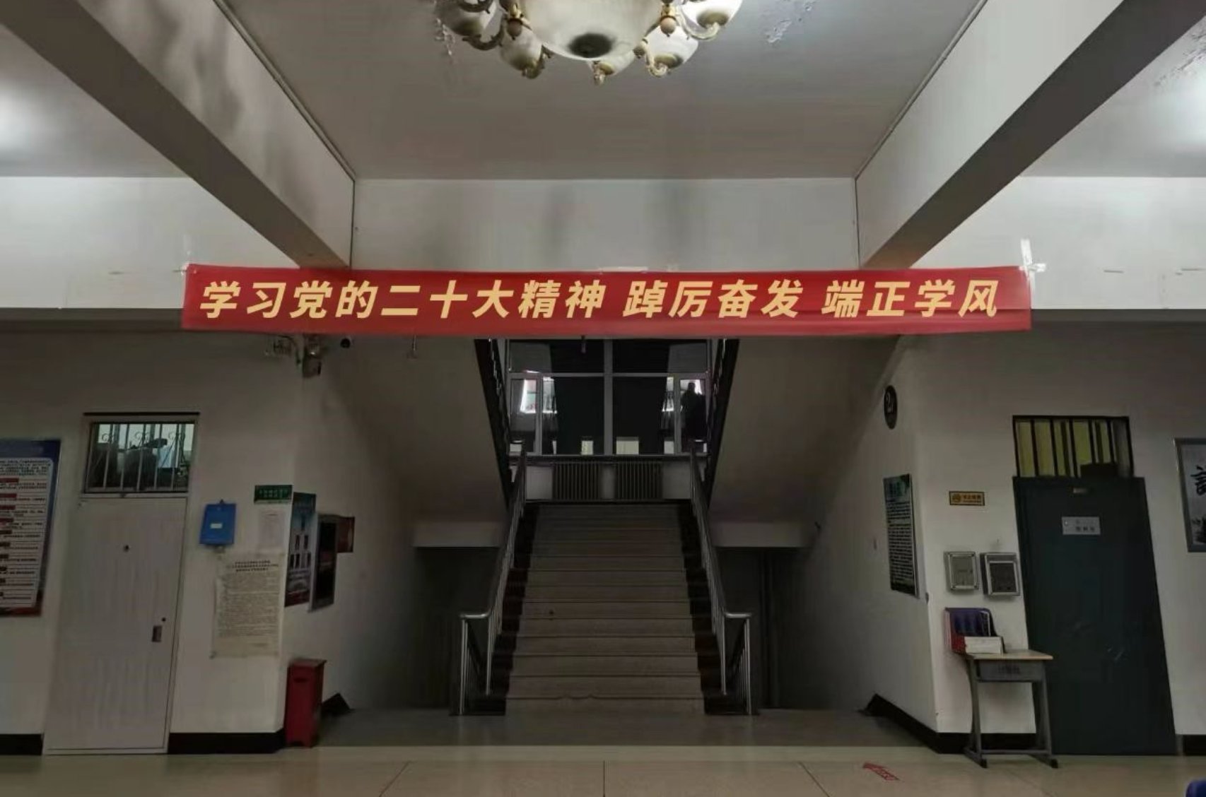 (2)学风建设条幅宣传:在崇实楼2楼大厅外悬挂条幅开展学风建设宣传。