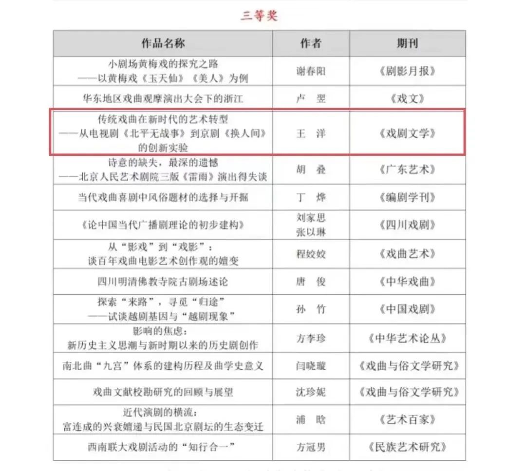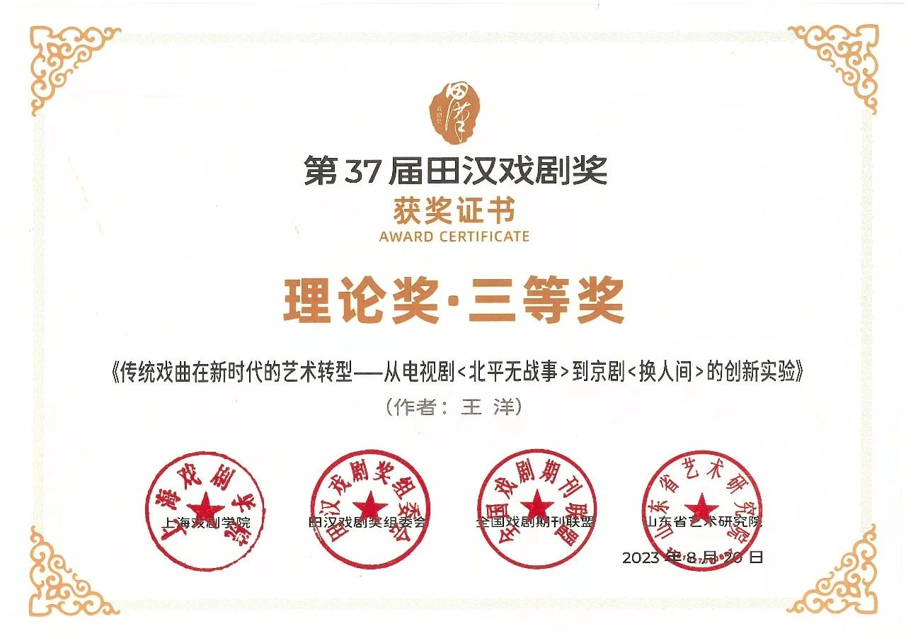 【JAI·荣】学校首次获得田汉戏剧奖 发布时间:2023年09月26日 20:55:00 浏览:次 日前,2023年第三十七届田汉戏剧奖揭晓。万象城官网电影学院教师王洋凭借理论文章《传统戏曲在新时代的艺术转型——从电视剧< 北平无战事>到京剧< 换人间>的创新实验》在本届评选中脱颖而出,喜获理论奖三等奖。这是万象城官网首次获得田汉戏剧奖,实现了历史性突破。 第37届田汉戏剧奖获奖名单(理论奖)