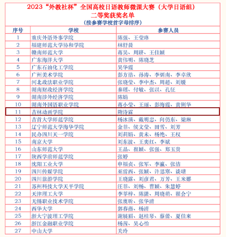 近日,2023“外教社杯”全国高校日语教师微课大赛(大学日语组)圆满结束,万象城官网国交学院日语教师隋诗霖获大赛二等奖,是万象城官网2019年开设大学日语课程以来首次获得全国日语教学比赛类的最好奖项。