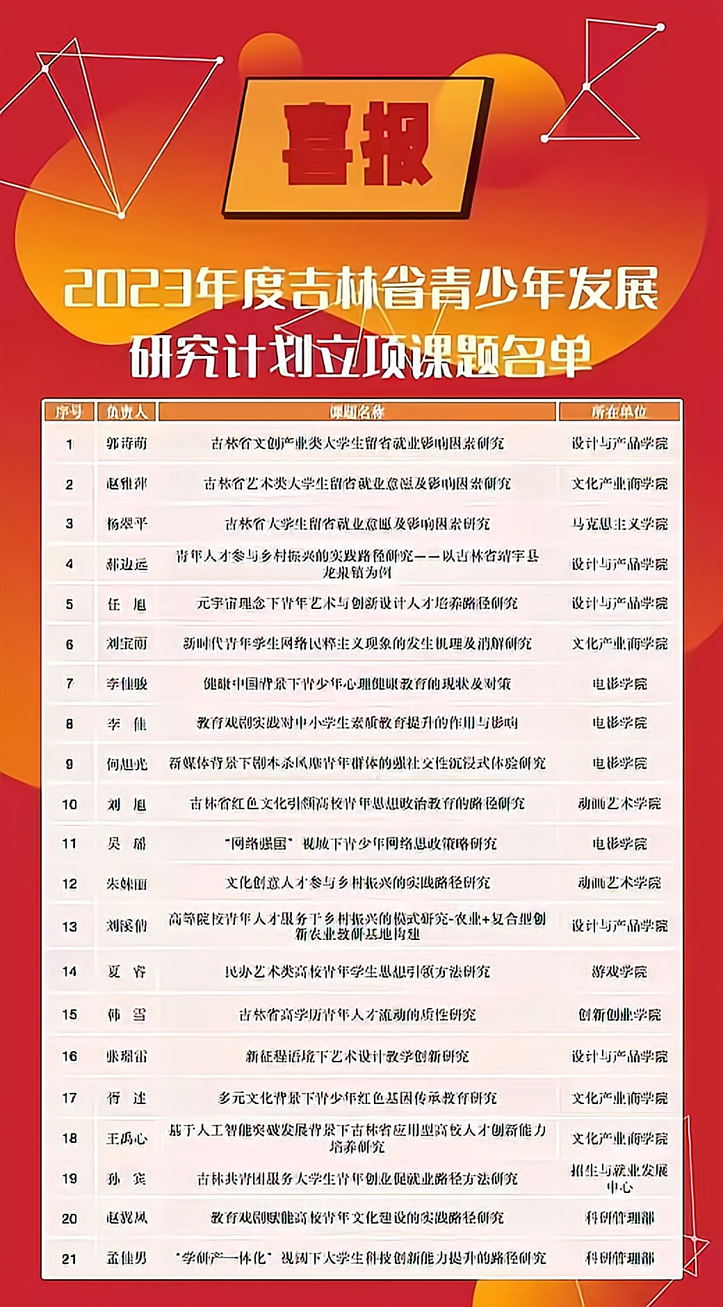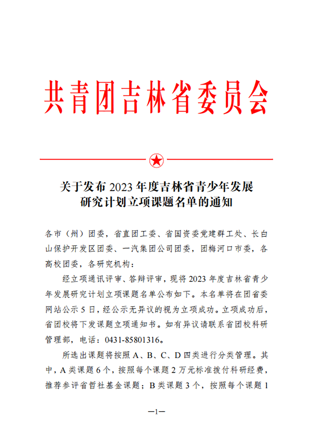 近日,共青团吉林省委员会下发《关于发布2023年度吉林省青少年发展研究计划立项课题名单的通知》,万象城官网共有21项课题获批一般项目立项,获批项目总数创万象城官网该课题立项总数的历史新高。
