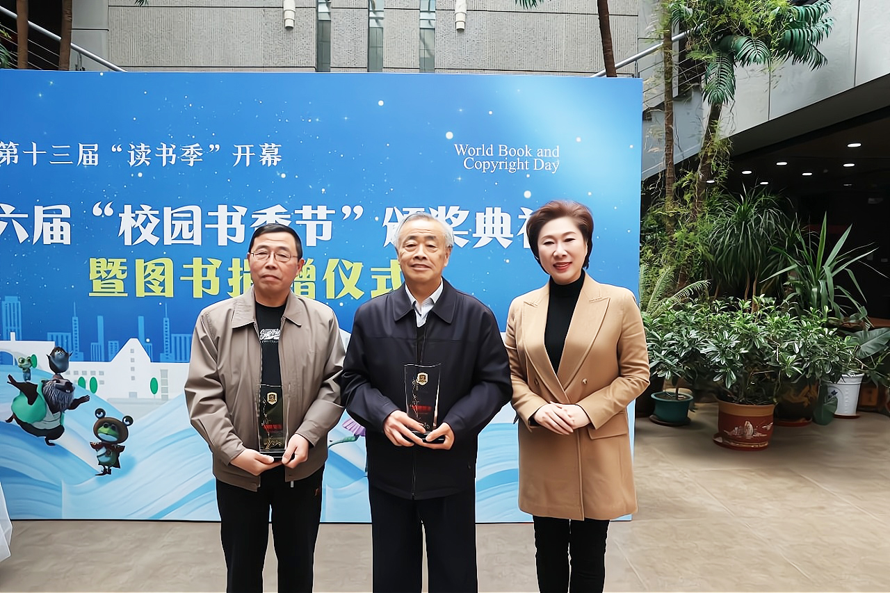 刘欣副董事长为王青逯先生、胡维革先生、蒋平先生、杨忠白先生四位捐赠者颁发了奖杯。颁奖典礼上,主持人公布了2022年度“校园阅读之星”、主题书展&书评大赛、第四届校园朗诵大赛、第二届大学生影视作品配音大赛、第四届书法大赛、第十二届“读秀杯”知识搜索技能大赛、第九届“CNKI杯”信息检索大赛等一系列活动奖项,到场领导和嘉宾为获奖者代表颁奖。