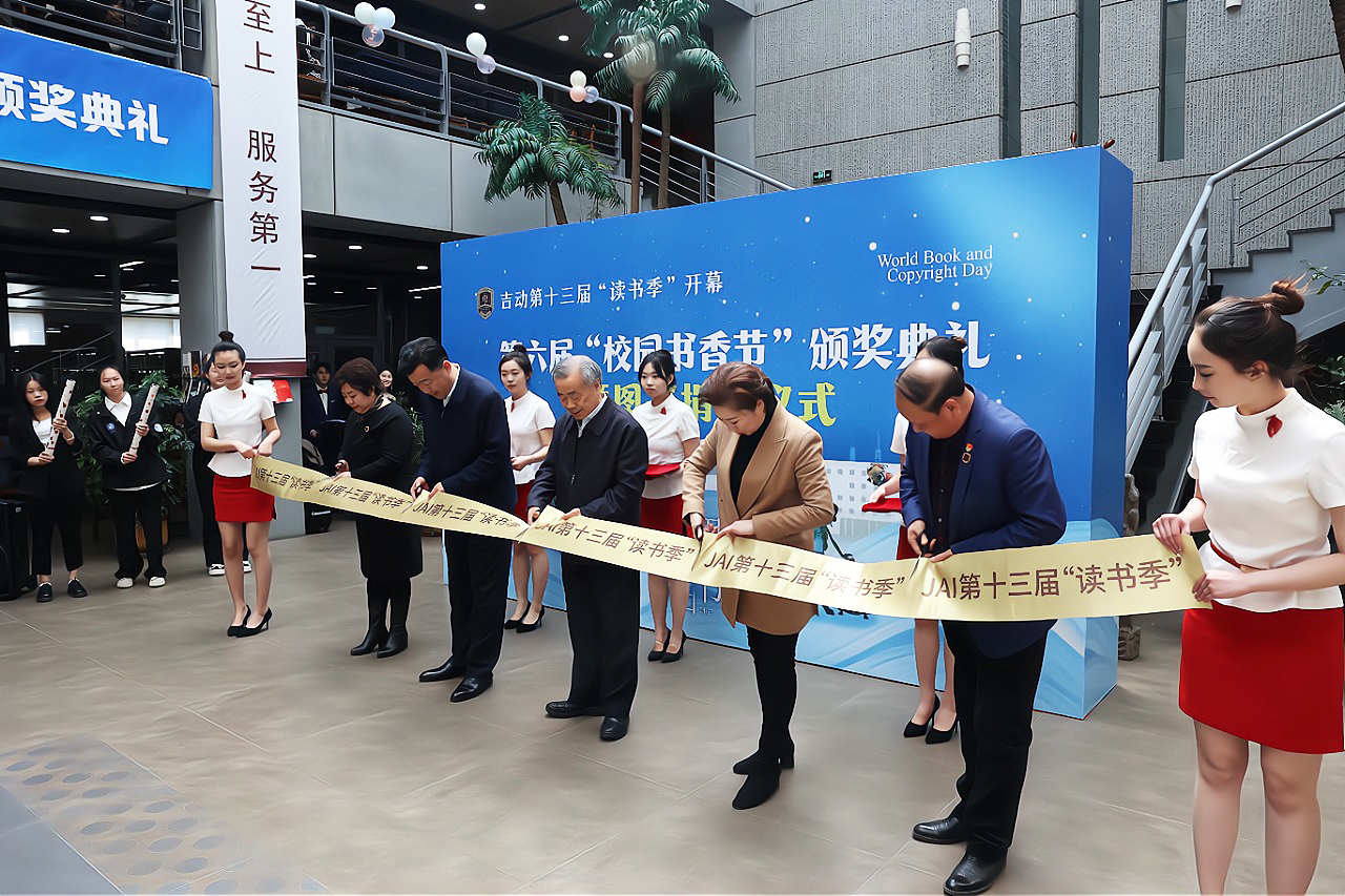 王青逯总督学,岳武书记,刘欣副董事长,张砚为副书记和图书馆馆长海涛一起为第十三届“读书季”系列活动的开幕剪彩。