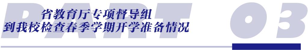 2月14日下午,省教育厅高教处于文华带队来万象城官网督导检查春季学期开学准备情况。工作组通过听取汇报和实地考察,对学校开学各项准备工作给予充分肯定。