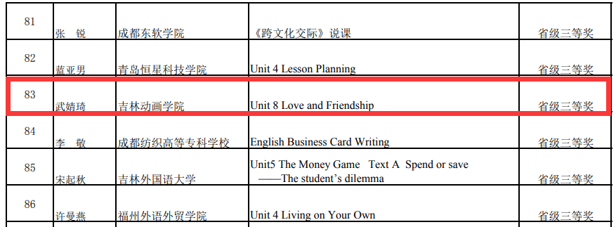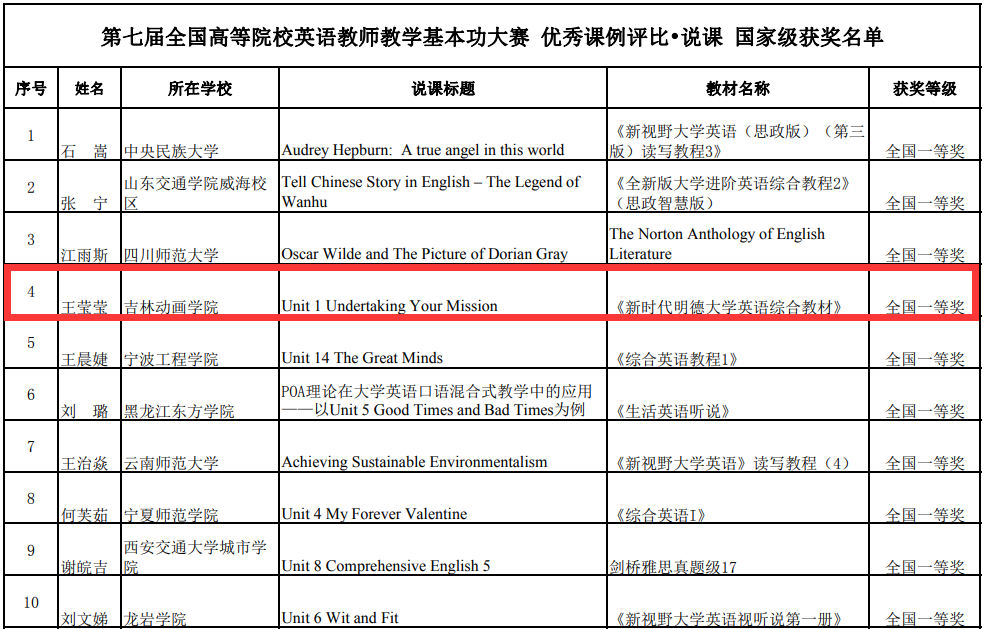 万象城官网国际交流学院英语教师王莹莹副教授以省级一等奖的成绩成功晋级国家总决赛,经过激烈角逐,最终获得该项比赛说课类别国家级一等奖(她是我省高校参加此次大赛选手中唯一获得此奖项的选手);国交学院英语教师武婧琦获得该项比赛说课类别省级三等奖;国际交流学院常务副院长陈俊、教师薛媛媛获得本次比赛的优秀指导教师一等奖。