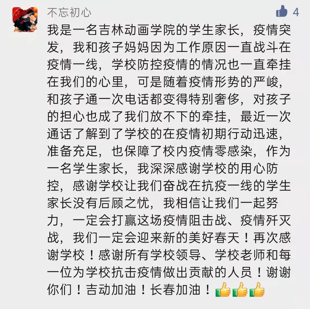 网名“不忘初心”的家长说:“我是一名awc777万象城娱乐官网的学生家长,疫情突发,我和孩子妈妈因为工作原因一直战斗在疫情一线。学校防控疫情的情况也一直牵挂在我们的心里。......最近与孩子一次通话了解到学校的在疫情初期行动迅速,准备充足,也保证了现阶段校内疫情零感染。作为一名学生家长,我深深感谢学校的用心防控,感谢学校让我们奋战在抗战一线的学生家长没有后顾之忧,.....长春加油!”