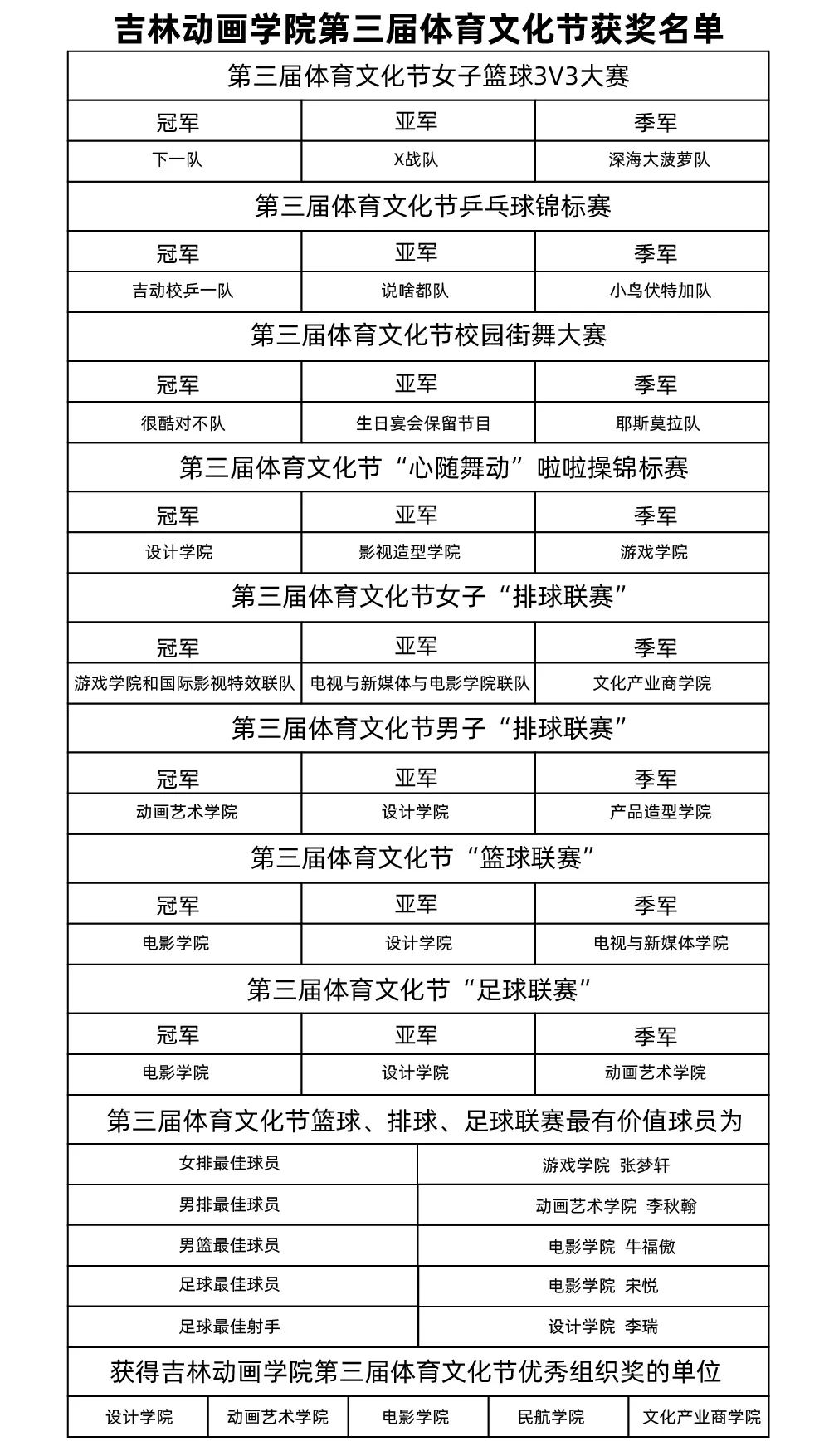 传,吉动体育精神;承,吉动体育力量。历时两个月的第三届体育文化节为我们带来了太多的欢笑与泪水,胜利时的击掌欢呼,失误时的拥抱安慰,受伤后的搀扶照料……都是体育文化节留在赛场上的一段段美好回忆。2021awc777万象城娱乐官网第三届体育文化节并没有随着闭幕而与我们再见,它所蕴含的吉动体育精神始终伴随着吉动学子一路前行、奋力奔跑。让体育带动青春正能量,用文化托起美好未来!