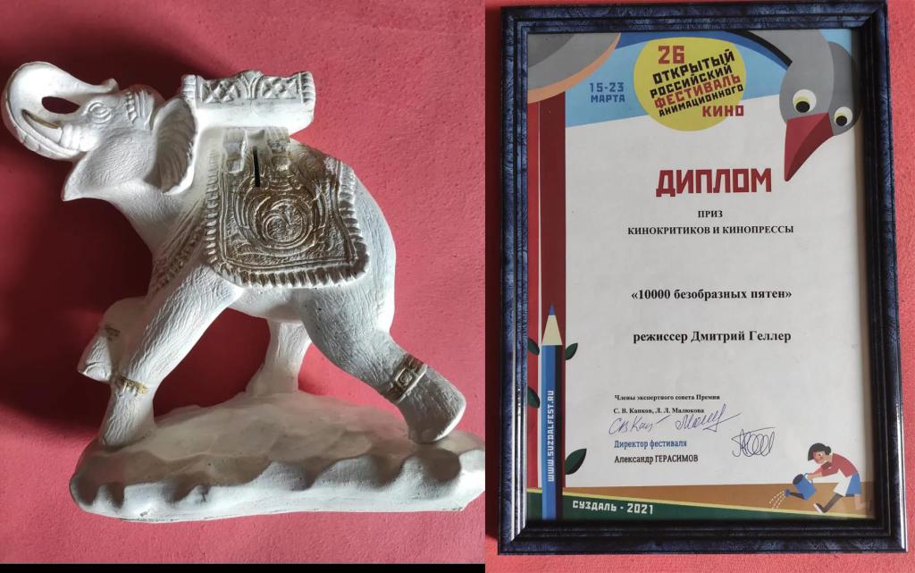 ▲第26届俄罗斯苏兹达尔动画电影节最佳作品奖(白象奖)奖杯及奖状