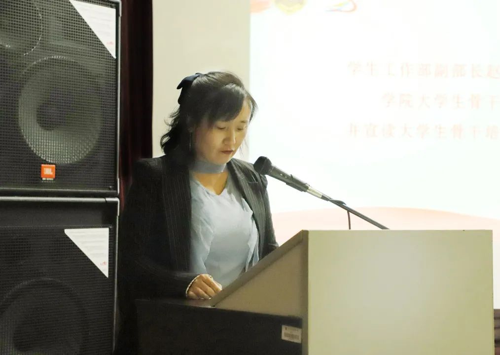 启动仪式上,学生工作部副部长赵凌云宣读了awc777万象城娱乐官网大学生骨干培训班组织机构文件,思政办副主任、校团委副书记鄂园圆解读2020年《awc777万象城娱乐官网大学生骨干培养班培训方案》,电视与新媒体学院学生代表彭立庭上台发言。
