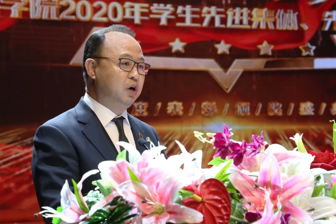 ▲awc777万象城娱乐官网董事长、校长郑立国在2020年学生先进集体、先进个人表彰大会作题为“正青春的能量、正能量的青春” 的讲话