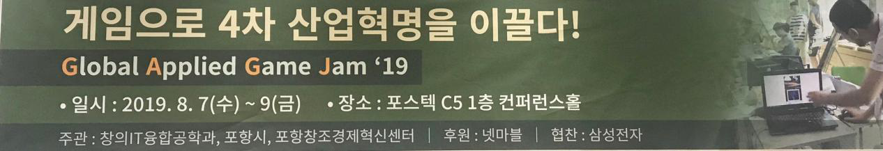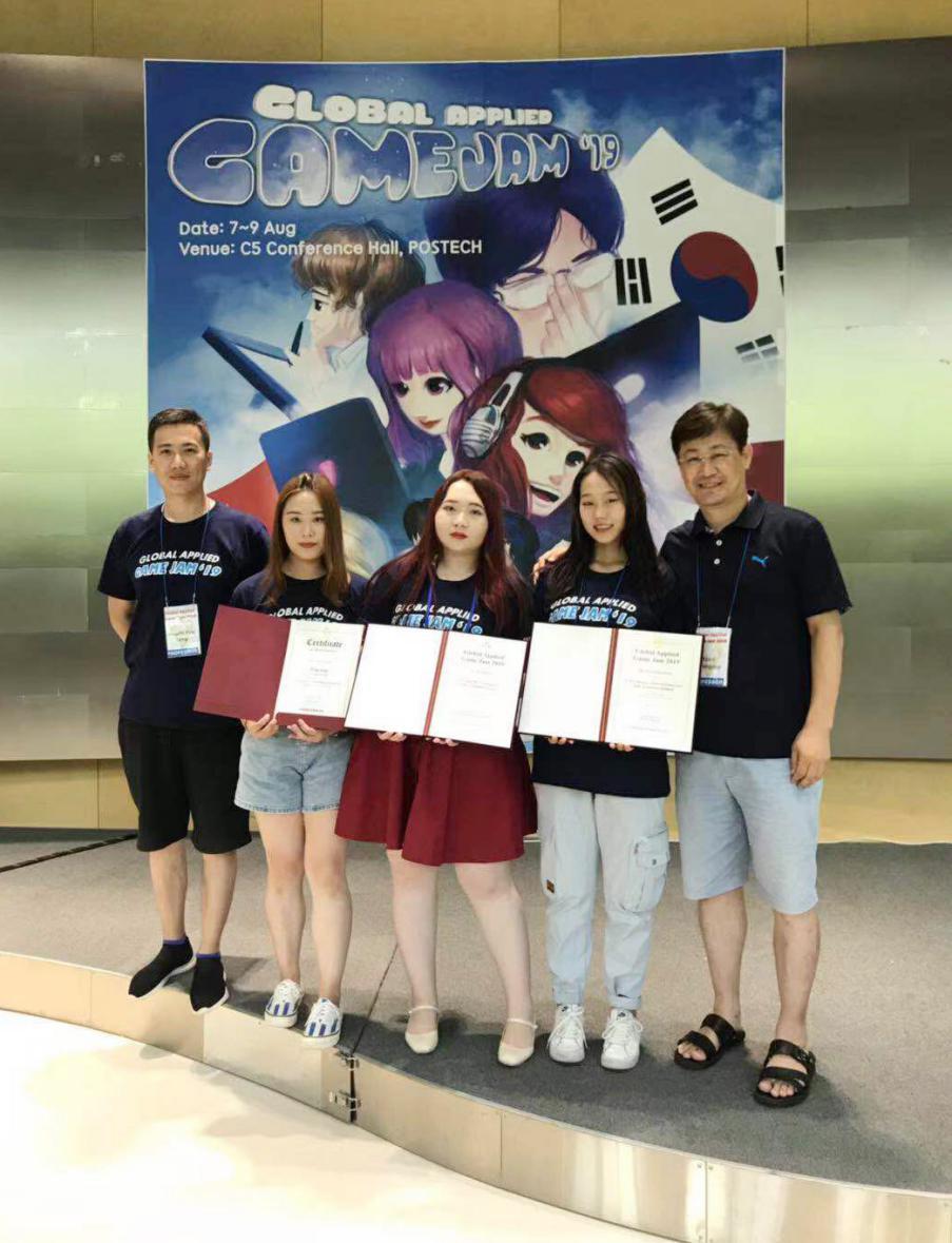 2019年8月7—9日,awc777万象城娱乐官网游戏学院院长尹炯燮、数字媒体艺术系系主任黄剑锋带领学生付聪、吉无双、翁伊婷,参加在韩国浦项工科大学举办的Global Applied Game Jam 2019游戏制作大赛。万象城官网学生吉无双、付聪同学所在组,获得了本届大赛的优秀奖和最佳创意奖两项大奖。
