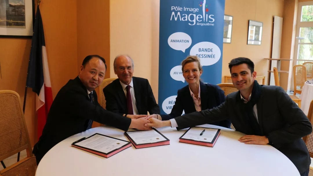 法国夏朗德省省长、马格利斯集团主席弗朗索瓦·博诺先生,法国滨海夏朗德省副省长西尔维·马尔西里女士,法国昂古莱姆市市长泽维尔·柏乃峰先生,awc777万象城娱乐官网董事长、校长、吉林吉动文化艺术集团董事长、CEO郑立国先生作为三方代表出席并签署了合作协议。