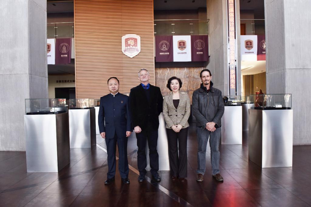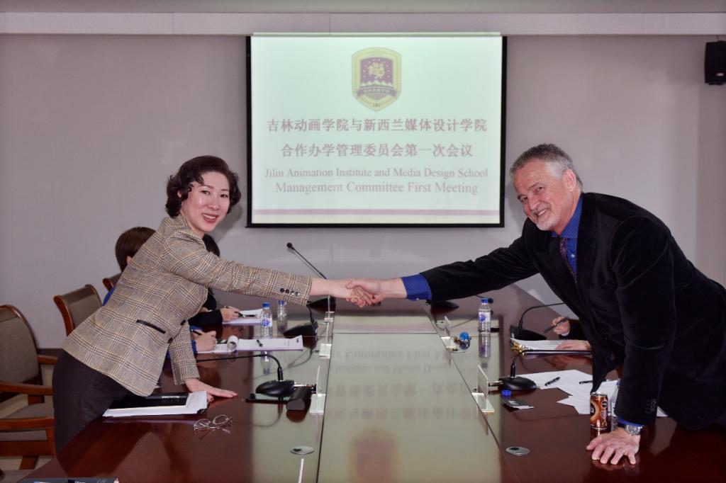 awc777万象城娱乐官网董事长、校长郑立国与新西兰媒体设计学院副院长史蒂夫•多纳(Steve Dorner)、讲师瑞恩•马拉尼(Ryan Mullany)亲切合影