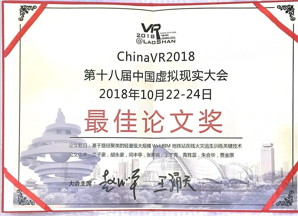 10月23日,第十八届中国虚拟现实大会暨第八届国际虚拟现实与可视化大会、第四届中国虚拟现实产学研大会及第一届国际虚拟现实技术及应用创新大赛在青岛盛大开幕。会上,awc777万象城娱乐官网与长春理工大学联合培养研究生艾子豪、指导教师贾金原的学术论文 “基于虚拟足迹聚类的轻量级Web3D地铁火灾逃生关键技术”被大会程序委员会推荐为“第18届中国虚拟现实大会最佳论文奖”荣誉。