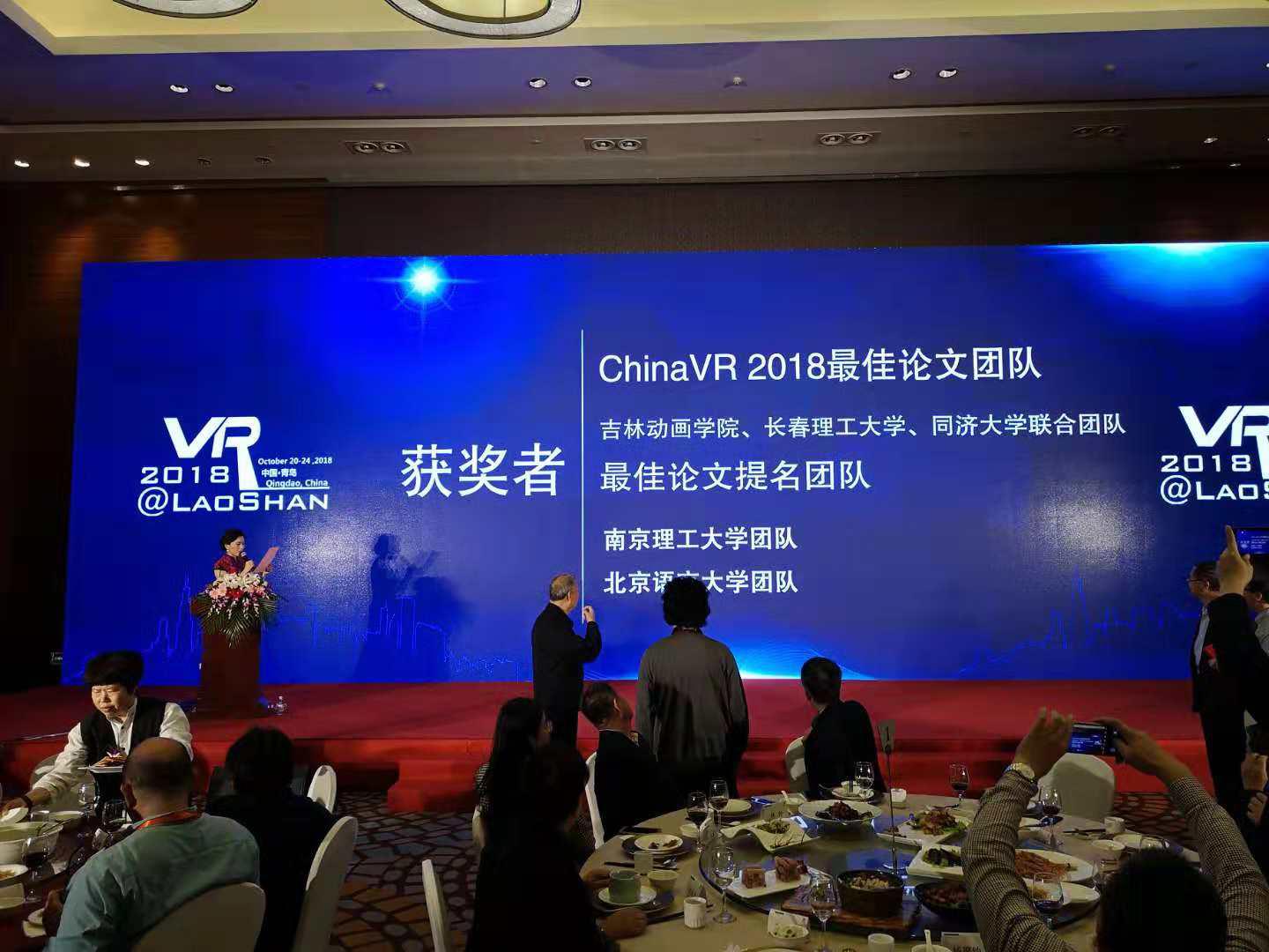 在颁奖典礼上,大会主席北京航空航天大学虚拟现实国家重点实验室主任、国家工程院院士赵沁平与北京理工大学信息与电子学部主任、教育部长江学者特聘学教授王涌天亲自授奖,艾子豪同学代表动吉林画学院、长春理工大学、同济大学团队领取了最佳论文奖证书,并合影留念。