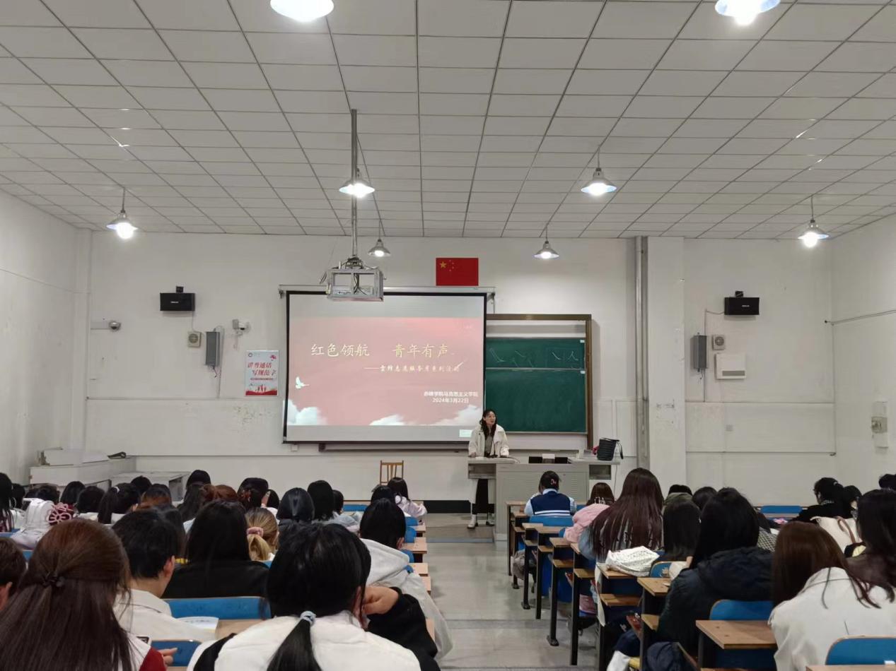 为更好地践行新时代雷锋精神、传播志愿服务理念,引领广大青年厚植家国情怀,进一步凝聚起奋进新征程、建功新时代的磅礴力量。马克思主义学院于2024年3月22日在崇学楼三楼西阶梯教室举行“红色领航青年有声”志愿者宣讲会。马克思主义学院团总支负责人刘宇婷老师与2022级、2023级全体学生共同参加此次活动。