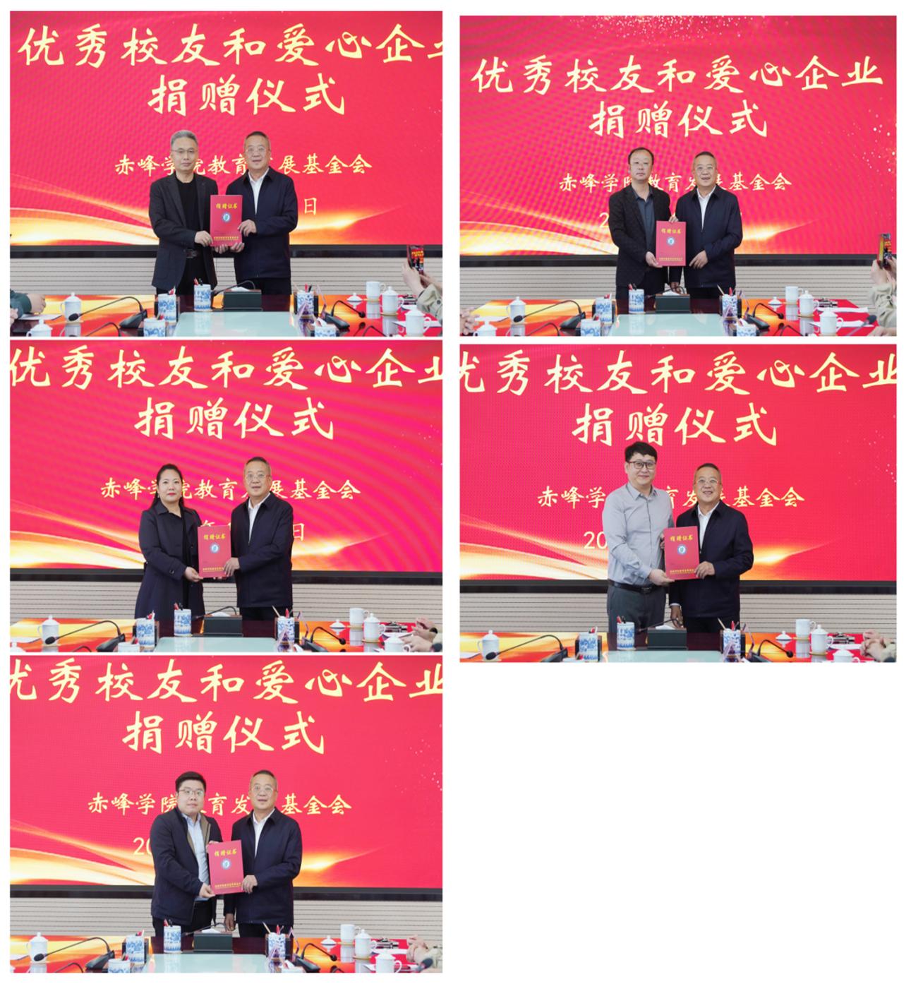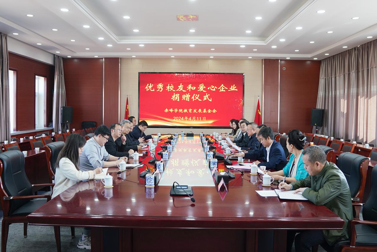仪式上,优秀校友、赤峰市题车杨公考学校校长杨书逸,优秀校友、赤峰市招商大使高志国分别捐赠人民币100000元;校企合作企业青软创新科技集团股份有限公司、北京安博大成教育科技有限责任公司、达内集团高慧强学软件(海南)有限公司分别为学校捐赠价值23750元、104800元、25059元的教学设备。徐振军副校长、齐建萍部长代表学校和教育发展基金会接受捐赠。