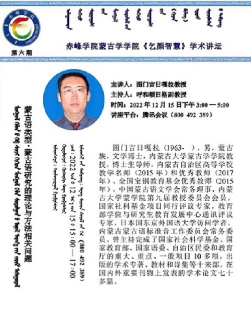 2022年12月15日和17日,由内蒙古大学蒙古学学院的图门吉日嘎拉教授和海日寒教授分别以《蒙古语类型·蒙古语研究的理论与方法相关问题》和《蒙古族现当代文学研究现状与期盼》为题作了精彩讲座,我院2022年度“乞颜智慧”学术讲坛圆满收尾。(关图雅供稿)