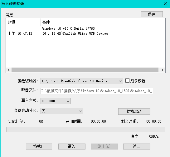 4.步骤2执行后出现如下图所示,我们可以看到在“映像文件”的右边已经显示出了我们刚刚选择的系统镜像的路径了,首先选择“格式化”按钮,将U盘格式化,格式化之后,注意了,打开“写入方式” 的下拉菜单,选择USB-HDD+;在“硬盘驱动器”的右边选择要制作的U盘;完成后点击“写入”,会有提示,要丢失数据,选择确定,就开始写入数据了。