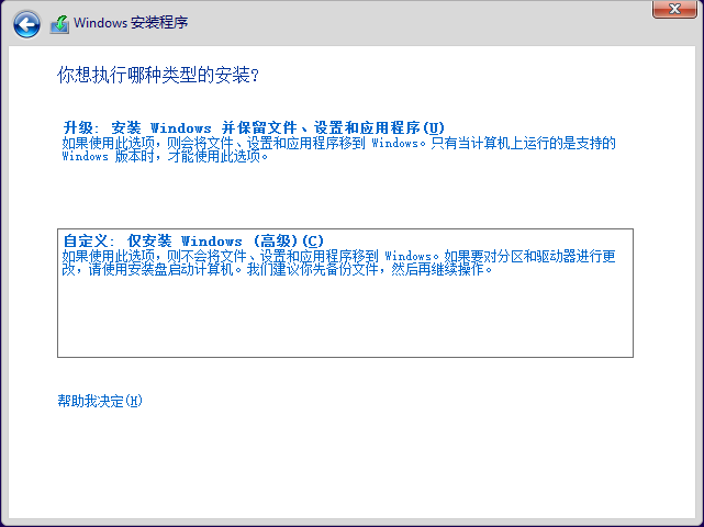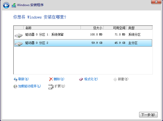 12.选择全新安装后,进入系统分区,根据自己的电脑要求,将系统装入C盘,选择驱动器(高级)选项。