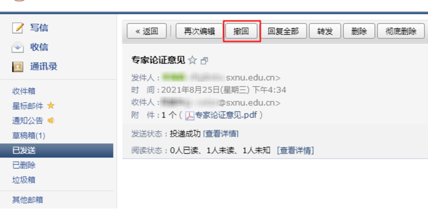 (1)对于已发送的邮件,在读信窗口,点击“撤回”(支持24小时内发送的部分邮件撤回);