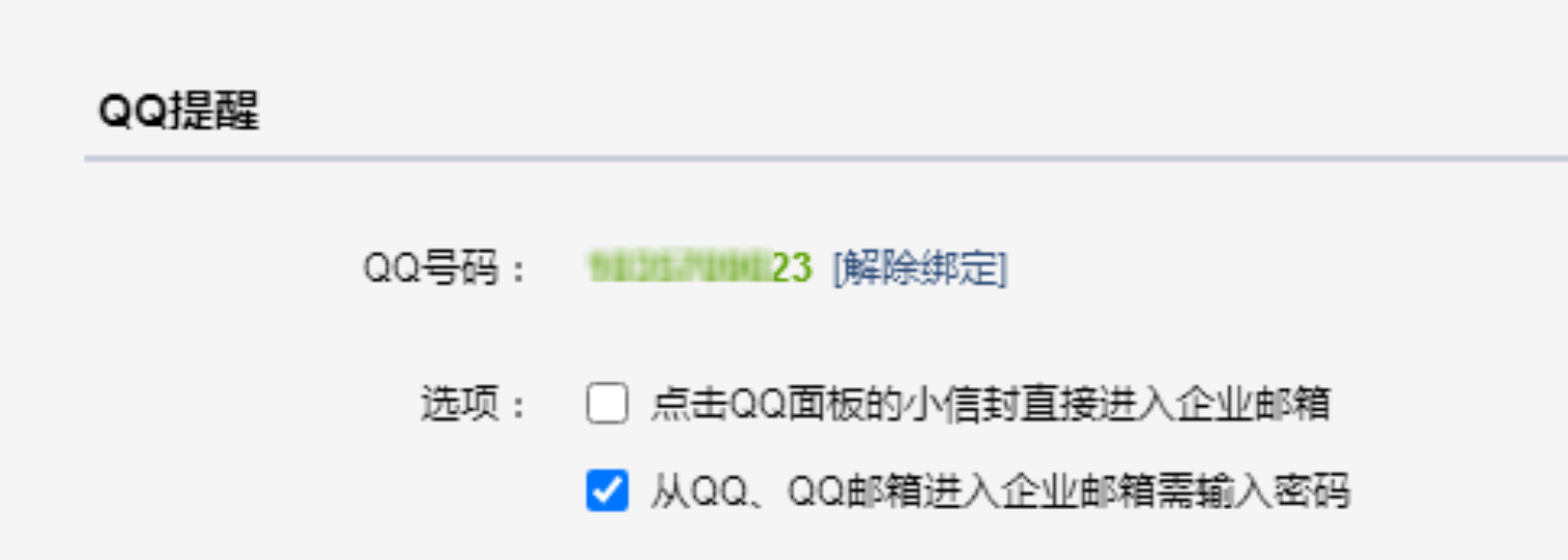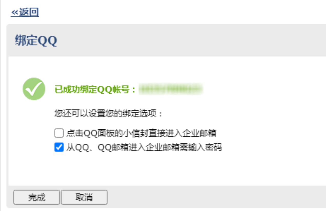 绑定成功后,若勾选“点击QQ面板的小信封直接进入企业邮箱”,则默认进企业邮箱,否则仍会进入QQ邮箱,还可以选择“从QQ、QQ邮箱进入企业邮箱需要输入密码”。