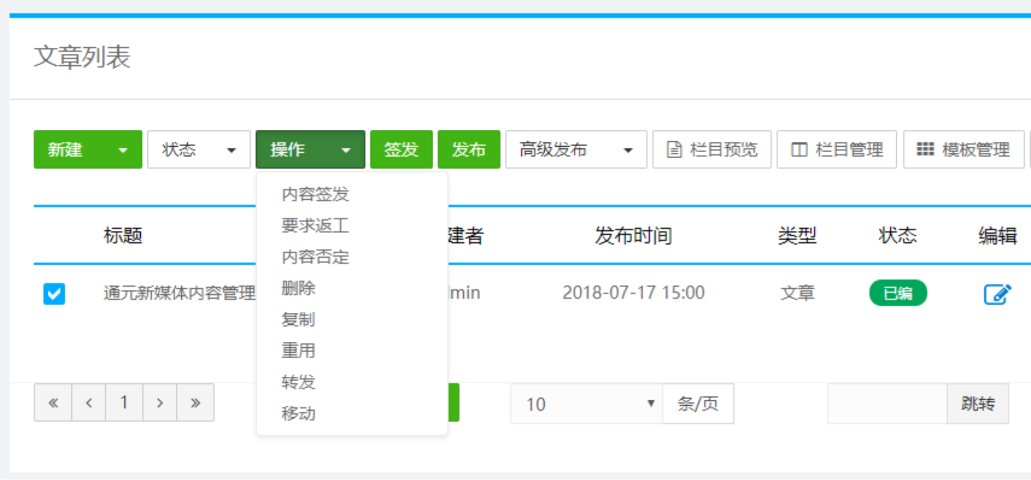 进入cms8后台,点击<功能区>的【内容管理】进入内容管理页面,选择任意栏目,可进行文章的录入、编辑、修改、签发、发布等操作。