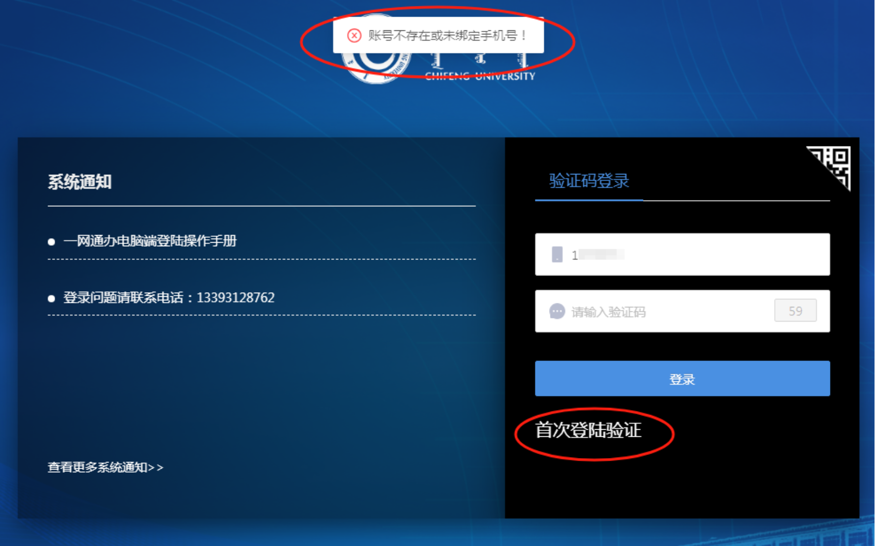 如果收不到验证码,提示“账号不存在或未绑定手机号”,请点击“首次登录验证”