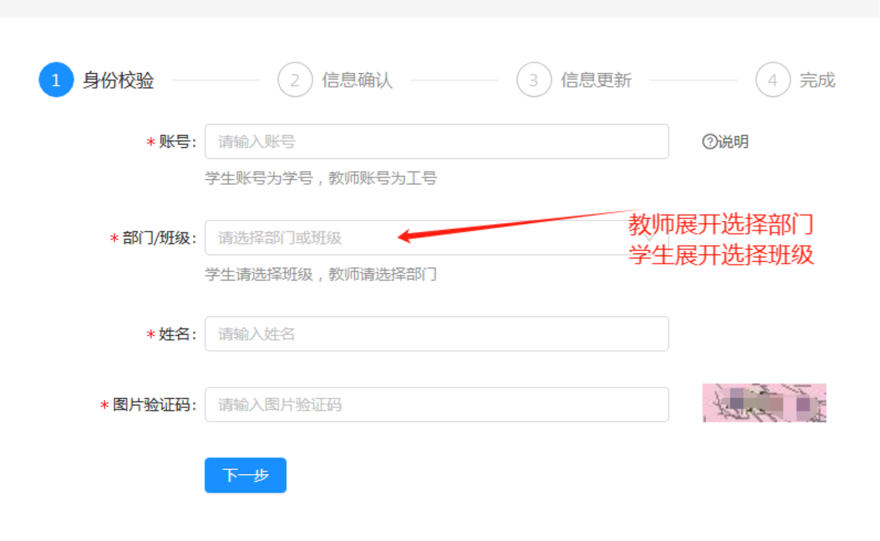 进入信息校验界面,填写“工号”或“学号”、“姓名”,