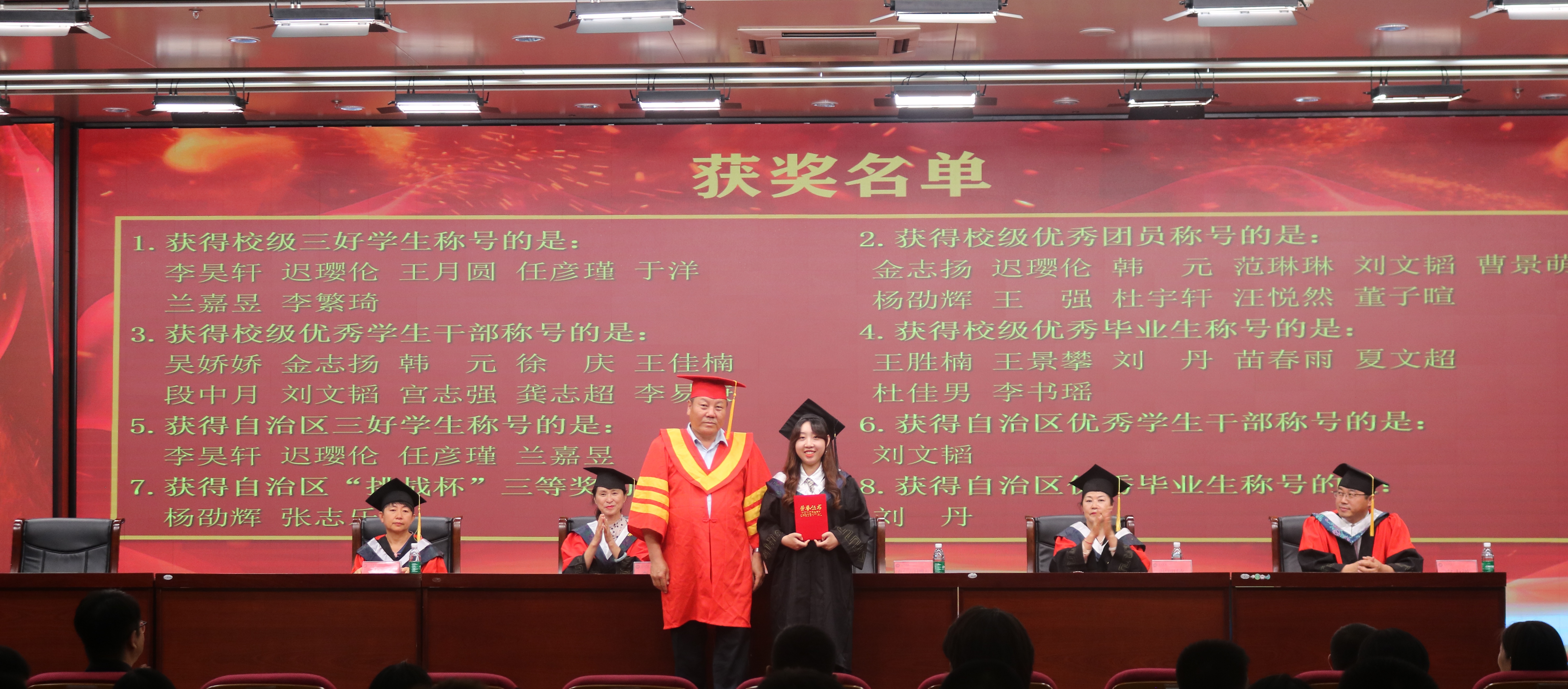 典礼在庄严的国歌声中拉开帷幕。首先,李秀丽书记宣读了毕业决定。布仁吉日嘎拉副校长为毕业生代表拨苏正冠,并向顺利完成学业的毕业生颁发了毕业证书。在宝力道博士的带领下,全体毕业生重温医学生誓言。2016级口腔医学本科一班王胜楠同学作为毕业生代表、2016级班导师高小波老师作为教师代表分别发言。最后,张丽敏院长寄语全体毕业生要树立远大理想,厚植家国情怀,始终保持勤学努力的好习惯,修身立世,胸怀坦荡,做一个有理想有担当有作为的新时代青年。期间,姜喜玲副院长宣读表彰决定,口腔医学院对“优秀毕业生”、“三好学生”“、优秀学生干部”、“优秀团员”以及在自治区“挑战杯”获奖的共32名学生进行了表彰。