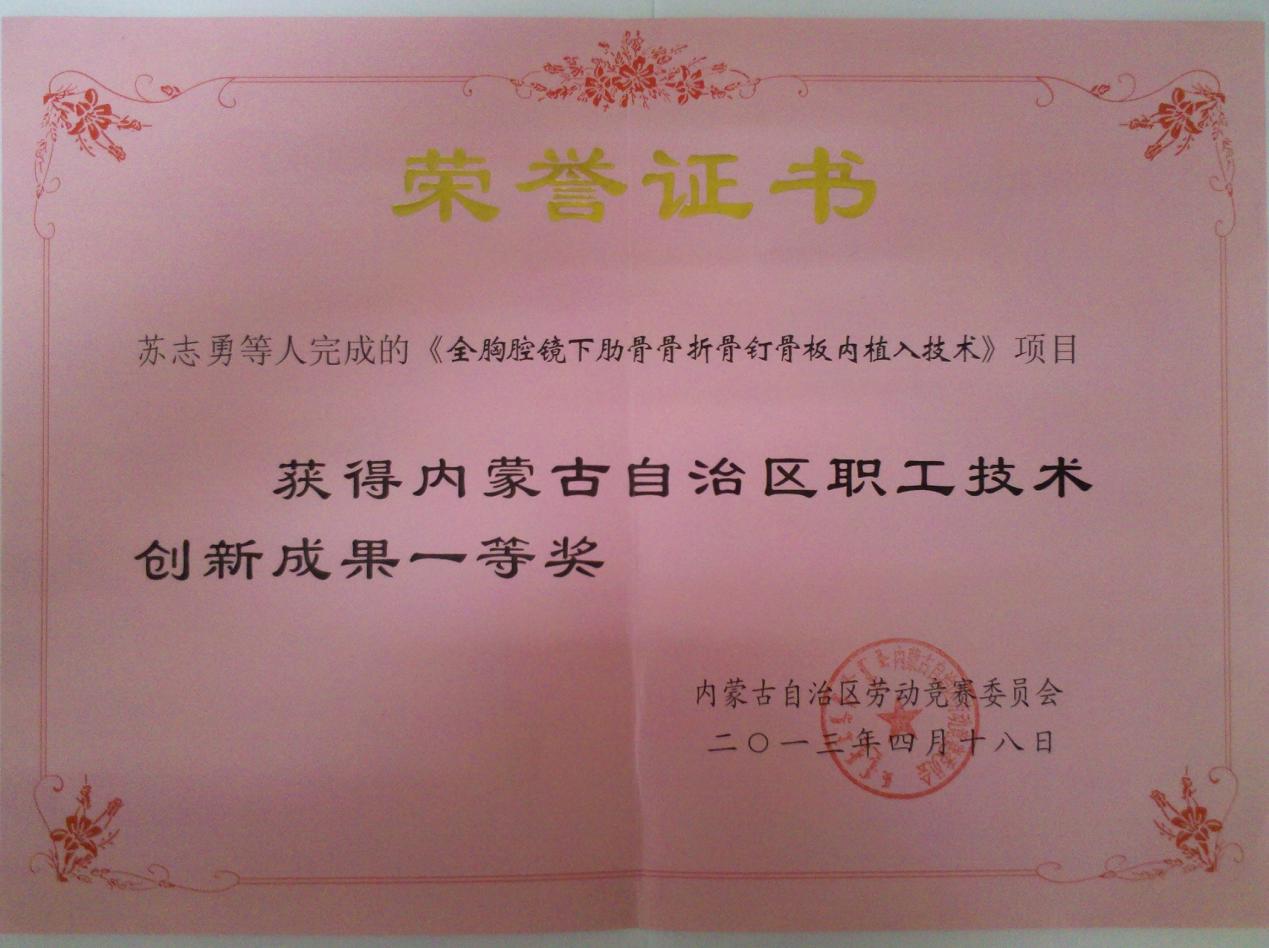 SU’S全胸腔镜下肋骨骨折骨钉骨板内植入固定技术,2013“内蒙古自治区职工技术创新成果一等奖”